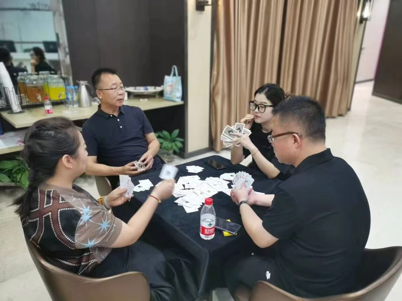 在運動會的摜蛋比賽現(xiàn)場,氣氛熱烈而又緊張。一張張牌桌整齊排列,參賽選手們兩兩相對而坐,神情專注而投入。他們的目光緊緊鎖住手中的牌,大腦飛速運轉(zhuǎn),思考著出牌策略。每一次出牌都顯得深思熟慮,又充滿了果斷和自信。